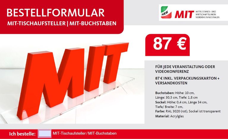 Sie wollen einen MIT-gebrandeten Hintergrund für Ihr Event oder unsere Wortmarke für den Vorstandstisch? Das ist bestellbar - natürlich in ertser Linie für MIT-Gliederungen in NRW aber auch für diejenigen, die die MIT immer schon in der Wohnzimmervitrine oder im Büro sichtbar haben wollten. Das Bestellformular finden Sie untenstehend als Download.